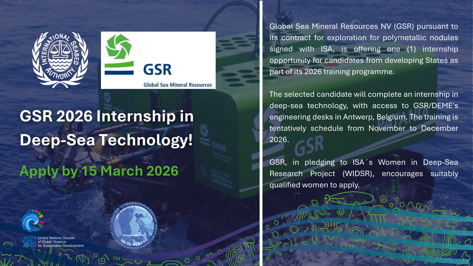 Global Sea Mineral Resources NV (GSR) is offering one (1) training opportunity for candidates from developing States as part of its 2026 training programme pursuant to its contract for exploration for polymetallic nodules signed with ISA on 14 January 2013.